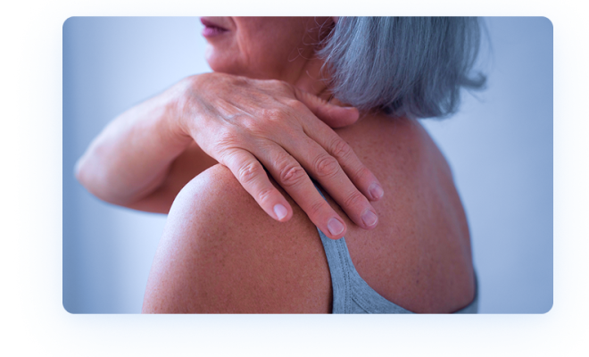 При поражении плечевого сустава (плечелопаточный периартрит) возникают боли в области плеча, усиливающиеся при движении. Боль может отдавать в шею, руку, лопатку. Появляются трудности при поднятии руки вверх, отведении её назад, вращении.